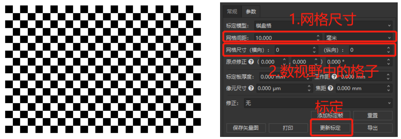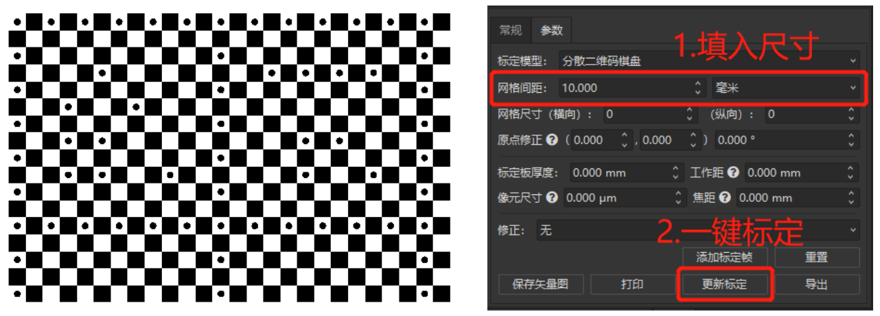 通過市場需求的調(diào)研,我們發(fā)現(xiàn)圖1中傳統(tǒng)棋盤格標(biāo)定的流程比較復(fù)雜,用戶除了需要知道網(wǎng)格的尺寸以外,還要通過數(shù)的方式確定在相機(jī)視野中的網(wǎng)格數(shù)量來完成標(biāo)定,如果實(shí)際應(yīng)用場景中網(wǎng)格間距尺寸比較小,用戶很可能數(shù)錯導(dǎo)致最后標(biāo)定失敗。