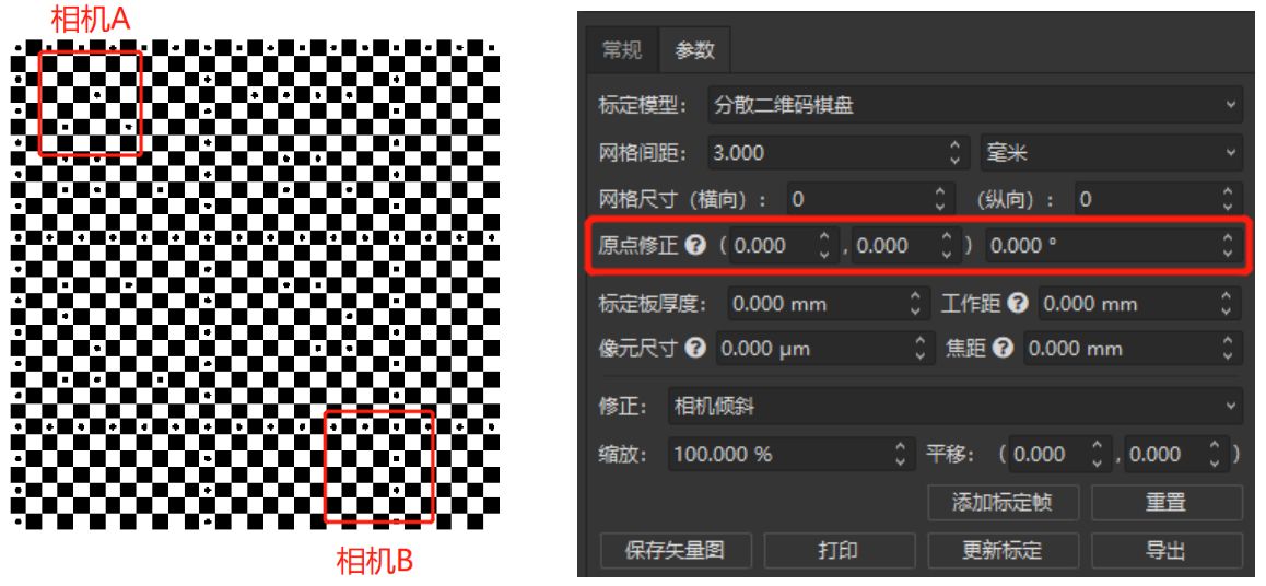 如上圖所示,用戶通過輸入網(wǎng)格間距、尺寸、原點(diǎn)修正等信息,可以將多個相機(jī)標(biāo)定在同一坐標(biāo)系內(nèi),實(shí)現(xiàn)多個相機(jī)的聯(lián)合標(biāo)定,從而計(jì)算出兩個相機(jī)內(nèi)任意兩點(diǎn)或者其他特征的距離。