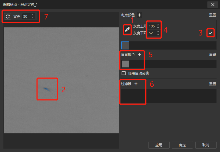 然后在參數(shù)欄打開斑點配置界面,用戶可以按照以下步驟完成斑點提取,順序與圖中的序號一一對應(yīng):