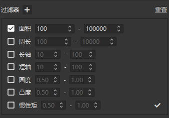 6.斑點過濾器配置如圖4所示,用戶可以通過這個過濾器過濾不符合標(biāo)準(zhǔn)的斑點,可選的參數(shù)有面積、周長等