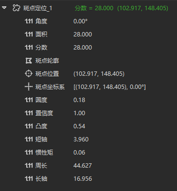 在提取到斑點后,靈閃會輸出斑點的相關(guān)算法結(jié)果來作為相關(guān)檢測的依據(jù),例如把面積的大小作為缺陷判斷標(biāo)準(zhǔn)的依據(jù),通過斑點位置進行缺陷區(qū)域的切割等,具體算法結(jié)果如圖6所示。