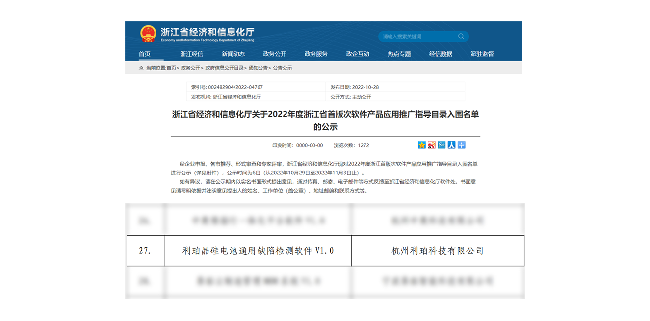 近日,浙江省經(jīng)濟(jì)和信息化廳公布了《2022年浙江省首版次軟件產(chǎn)品應(yīng)用推廣指導(dǎo)目錄》入圍名單,經(jīng)過多輪審查與專家評定,憑借行業(yè)領(lǐng)先的技術(shù)實(shí)力,杭州利珀科技有限公司憑借“晶硅電池通用缺陷檢測軟件 V1.0”成功入選。