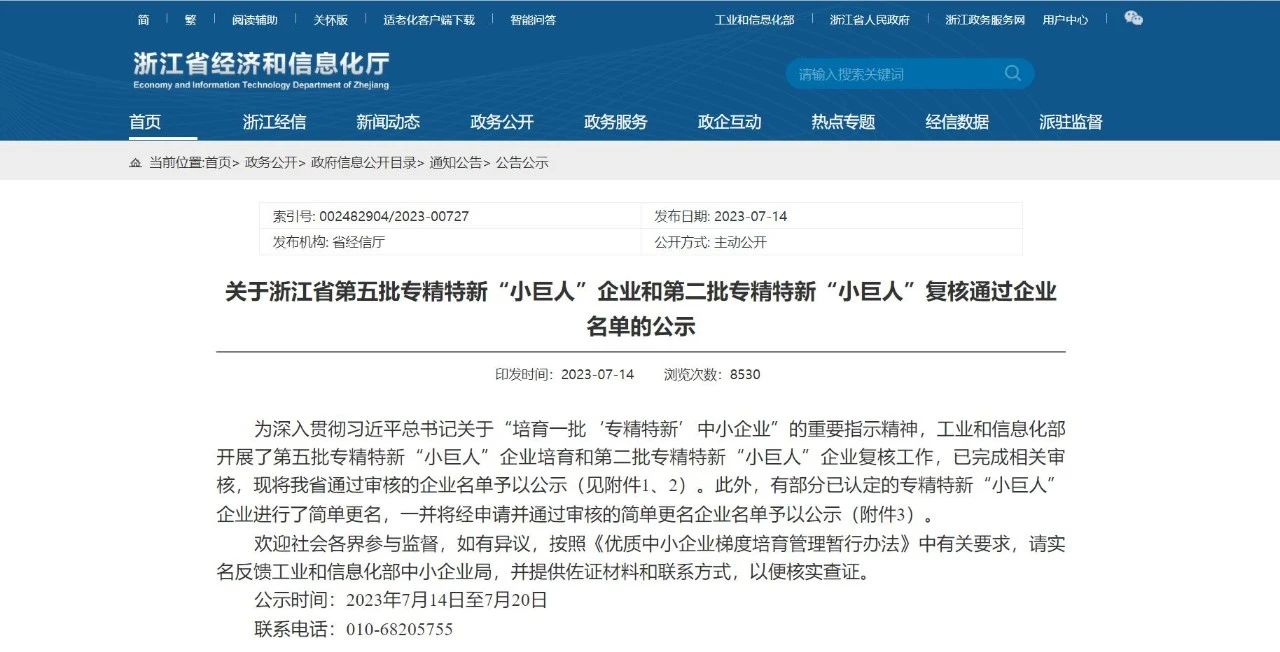 2023年7月,浙江省第五批專精特新“小巨人”企業(yè)名單正式公式,利珀科技通過層層嚴格評審,憑借優(yōu)異的技術(shù)創(chuàng)新能力、突出的成長速度和廣闊的發(fā)展前景入選該名單,榮獲國家級專精特新“小巨人”企業(yè)稱號。
