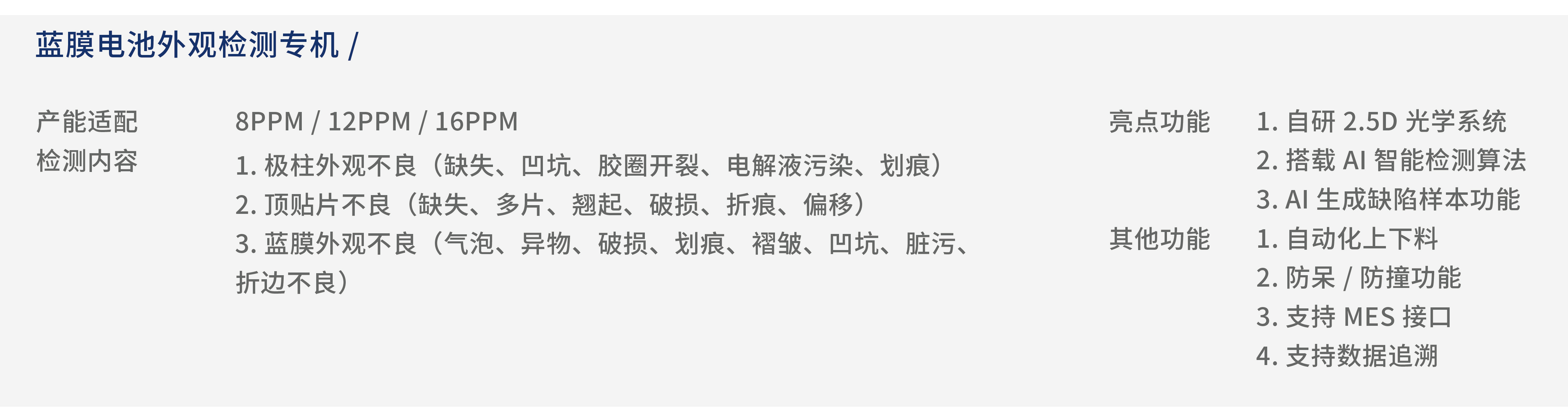 設(shè)備用于藍(lán)膜電池外觀(guān)檢測(cè),采用自動(dòng)上下料和特制輸送機(jī)構(gòu),搭載智能AI算法的自主研發(fā)檢測(cè)軟件,實(shí)現(xiàn)電池質(zhì)量的精準(zhǔn)品質(zhì)把控。