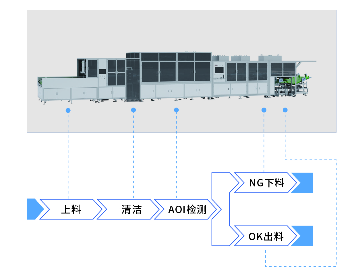 設(shè)備用于偏光片的檢測(cè),采用自動(dòng)上下料以及特制輸送結(jié)構(gòu),搭配自研AOI檢測(cè)軟件,對(duì)矢印章、缺陷打標(biāo)Mark、異物、氣泡、劃傷、凹凸點(diǎn)、折痕、撞傷、殘膠、臟污等缺陷進(jìn)行精準(zhǔn)檢測(cè)以及OK/NG分流,把控出貨產(chǎn)品質(zhì)量。